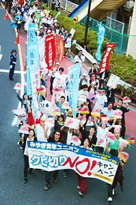 | “납득할 수 없다, 파견법 ‘개정’ ! 되찾자, 일하는 기쁨과 삶의 희망 !”을 슬로건으로, 도쿄 메이지 공원에서 5200명의 청년들이 모였다.(5월 16일 전국청년대집회 2010) |