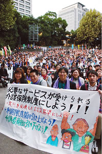 | 의료 개호 개선을 요구하며 벌어진 집회(2009년 1월 22일 도쿄 히비야공원, 민의련신문제공) |