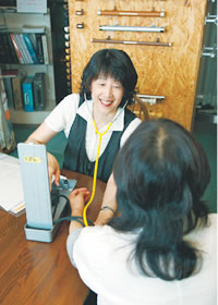 “바로 그 자리에서 혈압과 혈당을 재고, 눈에 보이는 ‘수치’를 보여주는 것이, 치료의 필요성을 이해하기 쉽기 때문”이라는 야마우치 간호사. 간호사이기 때문에 가능한 발상입니다.