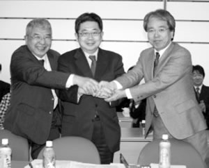 | 全日本民医連の藤末衛会長(右)、同副会長で前回の都知事選候補者の吉田万三さんと(2 月、全日本民医連の評議員会で) |