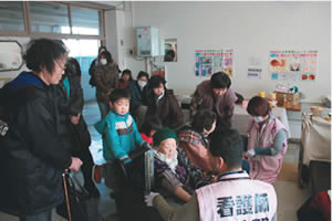 동시립 제3중학교(피난자 약 800명)에 피난하고 있던 사와무라 야스코씨(61)는 센다이 시내에서 피해를 입었습니다. 이윽고 시오가마시에 있는 자택에 이르렀지만 “여진으로 다시 쓰나미가 닥칠 위기가 있다”고 해서 급하게 피난했다고 합니다. “지갑만은 가지고 나왔지만, 항상 먹고 있는 혈압악을 집에 두고 왔다”며 안절부절 못합니다. 도쿄 타치가와 상호병원에서 지원을 위해 달려온 야마시로 나오코 간호사는, 당황하는 환자의 기분을 안정시키고, 냉정하게 대처하도록 하기 위해 정중히 이야기를 걸었습니다.