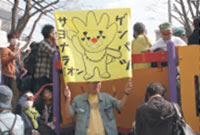 | 고엔지에서 원자력발전 반대를 외치며 행진하고 있는 청년들. (4월 10일, JR 고엔지 역 앞에서) |