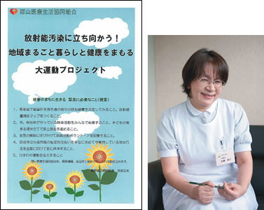 ‘민의련의 연대에 감사’한다는 사토 쇼코 간호부장. 왼쪽은 고리야마의료생협의 대운동 프로젝트 전단
