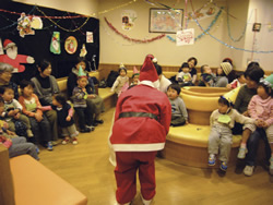 最後にサンタクロースの登場です。「どこからきたの?」などの質問が飛び交い、クリスマスプレゼントに大喜び。子どもたちの元気な歌声を聞き、私たちも元気をもらいました。