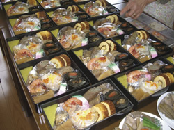 三二個の重箱を並べ、見本を見ながら手際よく詰めこんでいきました。三人のボランティアが配達を担当し、三時にすべての作業が完了。