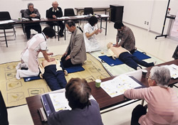 「救急蘇生法」ではAED(心肺蘇生のために使う救命装置)を使い、「胸骨圧迫を重視して」などと指導を受けながら、真剣な表情で受講していました。
