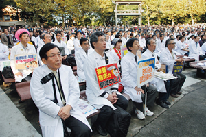 이 집회는 ‘전국의사유니온’과 ‘전국보험의단체연합회’(개업의들의 조직)가 중심이 되어 조직한 것. 그 이름도 <닥터즈 데몬스트레이션 2011>. 이처럼 많은 의사가 모인 항의행동은, 1961년, ‘국민개보험제도’가 도입되었을 때 벌어진 이래, 50년 만입니다.