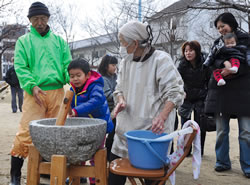 一月二一日は、柏花支部が地元の町会と協力して、約八〇人が参加。近所の子どもたちも集まり、順番に餅をついたり、つきたての餅をほおばったりと、大にぎわいでした。
