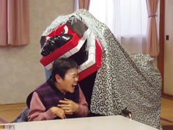 獅子の“正体”は、生協組合員のボランティアのみなさん。手作りで温かみある獅子が病棟やデイケア室をめぐり、患者さんや利用者さんを楽しませました。 獅子に「カプッ」と頭を噛まれた方の中には、“おひねり”を渡そうとする人も。