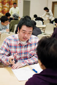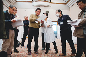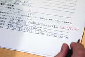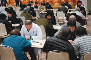 검진에는 200명 이상의 민의련 직원이 자원봉사로 협력. ‘어디서’ 잡힌 생선을 ‘언제’ ‘어느 정도’ 먹었는지, ‘어떤 증상’이 ‘언제부터’ 생겼는지 등, 구제신청에 필요한 정보를 한사람 한사람 정중히 묻고 듣습니다.