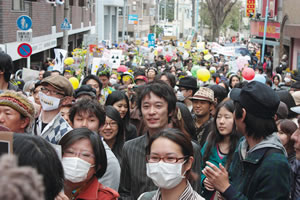| 작년 4월 10일에 도쿄 고엔지에서 열린 탈원전집회 후에 데모대 행렬. 대회장 주변의 도로가 데모대로 채워져 몸을 움직일 수 없을 정도. 최근들어 탈원전 운동이 급속히 확산되었다(사진 다다 시게마사 기자) |