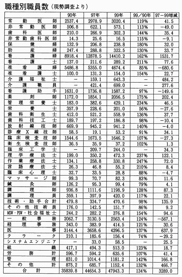 東京23区内で93年3月から98年12月に廃止された61病院のうち、100床未満の病院が9割を占め ています。付き添い廃止、施設の老朽化に加えて、入院患者数や手術件数の減少、大規模病院との競争などが主な理由です。地域に一般病院がなくなるという町 村もうまれています。