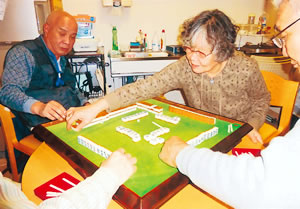 リハ体操をおこなっている理学療法室のかたわらで、「ジャラジャラ」と牌をまぜる音が響きます。あまりに真剣になりすぎて、顔も空気もピリピリモード に…。そんなときは、ボランティアが冗談を言ってみんなを笑わせたり、退院した共通の友人の近況を教えあったりして、場を和ませます。