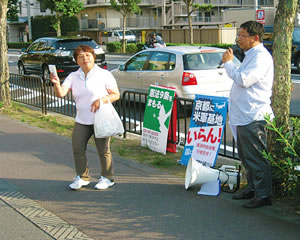 現地での怒りの抗議行動に呼応して、近くのショッピングモール前で緊急の街頭宣伝をおこないました。府内でもまだまだ知られていないのですが、近畿で初 めての米軍専用基地ができることの重大性を粘り強く訴え、工事中止まで続けていきたいと思います。