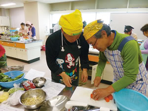 栄養課職員の実演のあと、4~5人のグループにわかれて調理開始。料理が大好きな人、初めて料理を作る男性、洗い物なら任せて…いろいろな方が入り混じって、わいわいおしゃべりしながら料理を作りました。