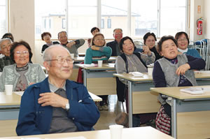 「秋田笑いヨガ」から二人の講師をお招きしました。「笑う門には福来たる」との言葉どおり、笑いは免疫力アップや血行促進、脳の活性化につながるとのこ と。それぞれの自己紹介をして、みんなで拍手の代わりに笑いで返事をしました。作り笑いでも腹式呼吸で身体が温まり、笑いの効果があるようです。
