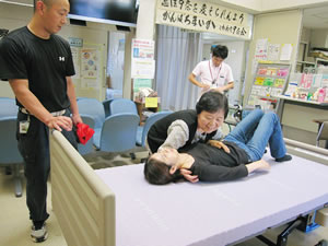 当日は、待合室に介護用ベッドを用意。参加者は動作の基本を覚えたあと、それぞれの知りたい介助方法について質問していました。