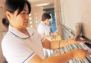 大変蒸し暑い日で、少し動くだけでも汗が噴き出します。途中で「あら、こんにちは」「何を配っているの?」などと患者さんに声をかけられながら、汗を拭き拭き大奮闘しました。