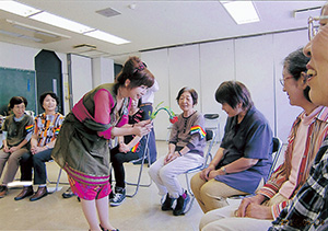 今年のメインは万代京央子さん(笑いと癒しのネットワーク代表世話人)を講師に迎えての「笑いヨガ体験」。インドの民族衣装を身に着けた講師が登場し て、ハンカチや薔薇の造花を使っての手品を披露すると、会場の空気が一気に和みました。笑いヨガのルーツや効用についての説明のあと、会場はリラックスし た笑いの渦に包まれました。