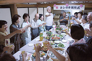 開所式には26人が参加しました。くす玉が割られ、民謡サークルと踊りサークルが歌と踊りを披露。ボランティアの方々が作った料理を囲みながら、参加者から期待のことばが語られました。