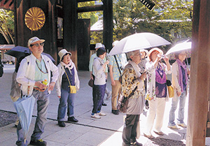 6月15日、当友の会平和部主催の「平和を学ぶ課外学習会」に14人が参加しました。 千葉県平和委員会の紙谷敏弘事務局長の案内で、靖国神社、遊就館を見学。遊就館では、戦闘機や人間魚雷など膨大な史資料が整然と立派に並べられていまし た。私は「今戦争が起きたら、またそれが歴史となってここに並ぶのか」と考えてしまいました。