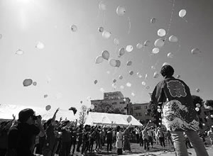 各地域の友の会や患者会が出展する物産展にも多くの人が集まり、地物野菜などがあっという間に売り切れました。東日本大震災の被災地復興と「なくそう原 発」を願う気持ちを風船に託し、青空に飛ばしてフィナーレとしました。