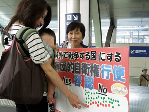 当友の会は職員といっしょに「戦争する国づくりを許さない八王子・たま民医連の会」を結成。五月から毎週金曜日にJR八王子駅前でシール投票をおこないながら、行き交う人々と対話を重ねてきました。