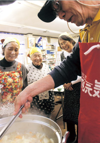 一一月九日、ウオーキング大会を開き、歩き終えた参加者が、豚汁とおにぎりを食べながら交流しました。