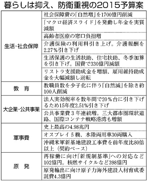 二〇一五年度政府予算案は、集団的自衛権の行使容認を踏まえて防衛予算を三年連続増の過去最高額とする一方、生活保護費削減、介護報酬のマイナス改定な ど自然増すら認めない社会保障費の削減、「暮らし抑え、防衛重視」となっています。一方で営利企業の医療事業への参入に道を開く非営利ホールディングカン パニーなどの準備をすすめています。この制度は、成長戦略や規制緩和の流れの中で提案され、医療事業に株式会社の資金を投入する仕組みを作ろうとするもの です。民医連はこうした医療の営利化・市場化をすすめる制度には明確に反対します。