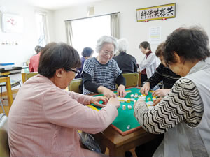 男性スタッフが得点計算を手助けするだけで、準備、運営は女性スタッフがおこないました。昼食は各自持参ですが、きずなグループからお吸い物のプレゼントがありました。当面は月一回ですが、マージャン女子会は順調に船出しました。