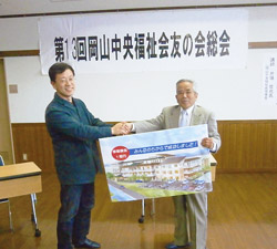 開設から35年を迎える特別養護老人ホーム健生園。2016年には現在の場所から移転し、新しく全室個室、120床のユニット型特養ホームに生まれ変わります。友の会で4年間にわたる建設資金運動にとりくんだ結果、目標金額の1億円を集めることができました。4月18日の友の会総会では、井上邦勝会長から健生園の竹永徹施設長へ、集めた1億円の贈呈式がおこなわれました。