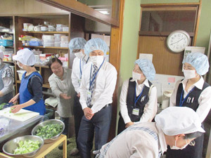 午後は当友の会がおこなっている高齢者配食サービス「ほっと亭」の作業風景を見学(写真)。代表の寺島知子さんの「お弁当を届けるだけでなく、地域の見守り機能も果たしている」という話を聞き、新入職員からは「友の会って考えていた以上に地域の中で幅広い活動にとりくんでいるんですね」などの感想が出されました。