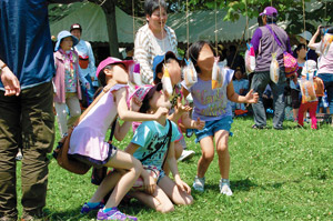中央舞台のパフォーマンスのほか、健康相談、ミニ運動会(写真)、似顔絵コーナー、屋形船の乗船、起震車体験、江津湖ウォッチングなど多彩な催しを三〇〇〇人が楽しみました。県農民連や新日本婦人の会による無農薬野菜の販売・バザーなどもおこなわれ大好評。メロンやトマト、お米が賞品の抽選会では、ヒートアップしました。「年に一度、ここで会ってお互いの健康を確認するのが何よりの楽しみなんだ」との感想が寄せられました。