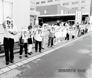 七月一五日の夕方、「戦争法案反対」の街頭宣伝を旭川市中心部の買物公園でおこない、友の会員も多数参加しました。