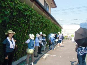昨年は「かがわ緑のカーテンコンテスト」で特別賞をいただきました。今年、県が企画した診療所の緑のカーテン見学&講習会には三〇人の参加がありました。講習会開催二週間前には、まさかの台風直撃でカーテンはボロボロに。しかし、あの手この手で見事に回復し、皆さんをお迎えすることができました。
