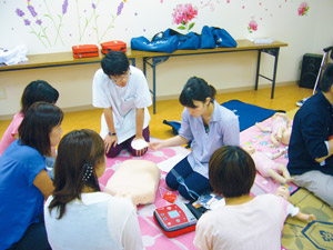 7月9日、8組の親子の参加で今年も救急講座を開催しました。友の会のボランティアや2回目の参加のママたちは慣れていましたが、子どもたちは不安で、泣いている子もいました。