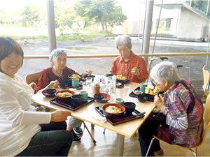 九二歳のAさん筆頭に女性三人組の椿班。「おでかけ班会」になると、いつもみなさん早くからおめかししてソワソワしています。今回は琵琶湖博物館の昔なつかしい農家を再現した展示をゆったりとながめて、思い出話に花を咲かせました。