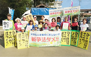 小城九条の会の呼びかけで、戦争法案反対を訴える早朝街頭宣伝を小城市内で八月から九月にかけて三日間おこないました。共産党をはじめ、多くの党派の市会議員、年金者組合、新婦人の会など、三日間でのべ五〇人が参加。「この悪法は絶対に通さない」と出勤する人たちに訴えました。横断幕は、参加した書家が書いたものです。