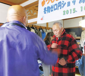 初めて来た人はジーパンの山をかき分けて自分にピッタリのサイズを探し当てると、「これいいわ。このまま履いて帰るわ」と満足そう。知り合いからこの日の企画を聞いてきた人は、「ありがとう。こんな立派な防寒着をもらって、おかげで安心して冬を迎えられます」と喜んでいました。「セーターがほしい」と1カ月前から話していた人も、セーターのほかにチェック柄の暖かそうな防寒着やズボンも選んで、「楽しみだったんや。来年も元気で来んなん。またよろしく」と深々と頭を下げて帰りました。
