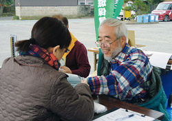 血圧測定、体組成計、足指力測定をおこないながら、被災者の皆さんのお話をうかがいました。「血圧が高くなった」「運動の必要性は分っているけど、そんな気分になれない」「体重が減った」など、一日も早く元の生活に戻りたいという気持ちがひしひしと伝わってきました。今後、医療生協として被災地にどう関わっていけばいいのかが課題です。