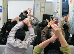 一二月八日、当診療所で健康教室を開催しました。テーマは「腰痛体操」。柳原リハビリテーション病院の理学療法士の中川卓也さんを講師に、患者さんと職員合わせて三五人が参加しました。