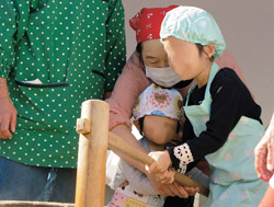 もち米をつき始めると、「おこめがおもちになるんだよ」と言われた子どもたちは興味津々。もちをつく人、かえす人と、昔とった杵づかで年配の方も活躍していました。