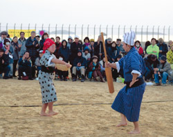 日本政府の辺野古新基地建設阻止でたたかっている辺野古住民は、二〇一六年の初日の出を辺野古の浜で迎え、初御願をおこないました。初御願は、辺野古住民の間で伝統的におこなわれている神聖な行事で、地元の長老を先頭にしてニライカナイの神様に平和と繁栄、五穀豊穣を願うものです。沖縄舞踊「谷茶前」を親子で踊ったり(写真)、ラインダンスを踊ったりして楽しくなごやかにおこなわれました。