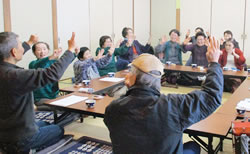食事の後は、元長町病院事務長の渡辺建寿さんがリードして脳トレ。「つながることと笑うことは、健康で長生きするためにとっても大事なこと」と渡辺さん。「はい、右手でグーチョキパー、左手でそれに負けるグーチョキパー」と、笑い声の絶えない楽しい脳トレとなりました。終了後は「次回も楽しみにしてます」という声が多くの方から聞かれました。