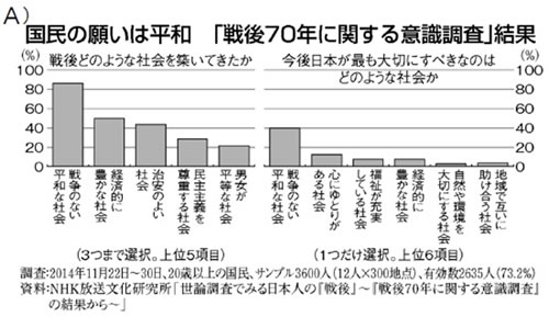 こうした共同や行動の根源には、戦後70年間築いてきた平和を求める確固とした国民意識があります。NHKが実施した「戦後70年に関する意識調査」(2014年)では、戦後70年、築いてきた日本社会のイメージとして「戦争のない平和な社会」との回答が87%を占めました(資料A)。