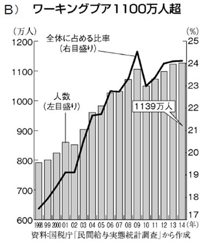 年収200万円以下の働く貧困層(ワーキングプア)は、安倍政権の2年間で49万人も増加し、1139万人(2014年)、全労働者の24%に達しました(資料B)。労働者の賃金は1997年から2013年で12%も減少しています。これらの背景には大企業が世界一活躍しやすくする国をめざす雇用制度の改悪があります。正規雇用は1997年から2013年までに518万人減少し、不安定な非正規雇用は754万人も増加、1962万人に達し雇用労働者の4割近くを占めています。貯蓄ゼロ世帯は30%に上っています。非正規雇用が拡大した世代はすでに40代の働き盛りとなり、就職氷河期と言われた人たちは45歳を迎えています。この世代が現状のまま65歳を迎えるなら20年後の日本社会は深刻な事態となります。