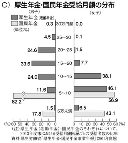 一方で、年金収入だけでは生活できない実態があります。国民年金は年金保険料を40年間納付した場合の満額支給でも月額6万6000円弱(年間80万円弱)にすぎず、平均の支給額は4万4000円にとどまります。家賃を支払ったらほとんど残らない水準です(資料C)。現在65歳以上の年金受給者3031万人の3分の1にあたる1047万人がこの国民年金の収入だけで生活しています。特養待機者が2009年から2014年のわずか5年で約10万人も増えていますが、その背景には施設の不足とあわせて、高齢者の中での貧困の広がりが反映していると考えられます。月額10数万円から20万円前後の費用負担を要する有料老人ホームやサービス付き高齢者向け住宅は、国民年金しか収入がない高齢者にとって「終の棲家」の選択肢には到底なり得ないからです。さらに無年金高齢者は93万人にのぼると推計されています。
