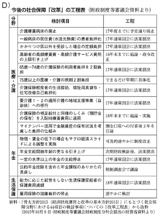 2016年からの3年間を「改革集中期間」に設定、毎年1兆円程度必要な社会保障の自然増を5000億円程度に圧縮する計画です。削減のほとんどを医療、介護分野で行うため、診療報酬・介護報酬の引き下げ、公的給付範囲の制限、患者申し出療養など混合診療の開始、患者・利用者の負担増、都道府県単位の医療費の抑制(※)、地域医療構想による大幅な病床削減(※)や医師数等の抑制と統制など公的な医療・介護費の極端な抑制と医療提供体制を縮小していくための改悪が方向づけられています(資料D)。医療崩壊、介護難民を生み出した小泉構造改革(※)をはるかに上回る規模の削減をすすめる方針です。