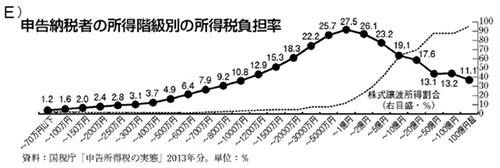 税率を10%へ引き上げる計画で検討されている軽減税率(酒類、外食を除く食料品の税率を8%に据え置く)が導入されても、年間1世帯当たり4万円以上の負担増となる見込みです。消費税の負担率は所得が多いほど軽く、少ないほど重くなる(逆進性)という根本的な欠陥はさらに拡大します。消費税を2%引き上げると約4兆4000億円の税収増となりますが、これは富裕層の資産の1.46%に過ぎません。日本の所得税負担率は、所得が1億円を超えると税率が下がる不公平なものです(資料E)。所得税に応能負担原則を適用すれば消費税を引き上げる必要は全くありません。