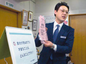 「死ぬまでに不安なことは何ですか」の質問から始まった終活セミナー。四月二日、城西診療所友の会は特別セミナーを開き、一級葬祭ディレクターの結城健司さんが終活・お墓・葬式について話しました。